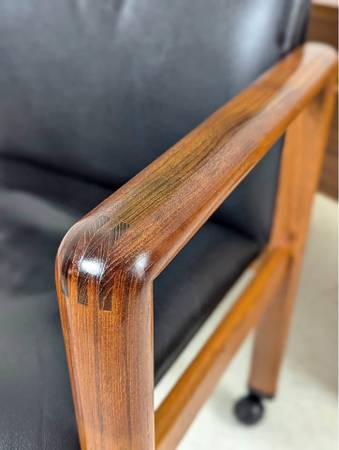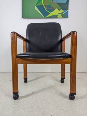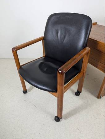 Nice mid century modern solid teak framed chair with black leather & smooth rolling casters. Additional photos available upon request. Free delivery within a 5 mile radius.