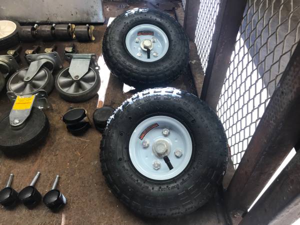 Miscellaneous caster and wheels, some swivel and some fixed. Most are new, the two in the upper left are missing some tread. What you see is what you’ll get.