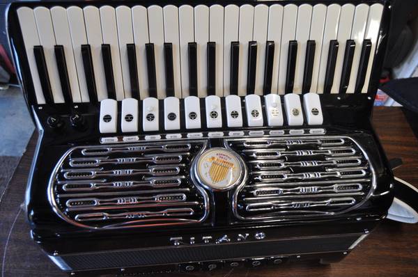 Lightly used and in excellent condition Titano Virtuoso accordion. This instrument was my father in laws. he would put on his Lederhosen and do gigs at retirement homes and an occasional party. The Virtuoso is a top of the line accordion by Titano, Italian made and they have a decades long history of being some of the best squeeze boxes know to man. Comes with a soft carry bag by Hohner. Shows some slight signs of use but I"m sure it plays great. Come and check it out.