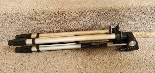 Tripod with telescoping legs and final adjustment crank, gold and black color. Full leg height: ~50", Max height with crank: ~60", Collapsed: ~24x4" for easy carrying. Cash Only.