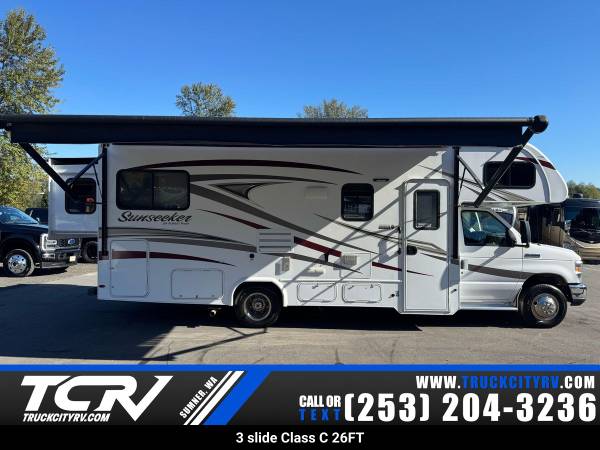 2018 Forest River Sunseeker 26Ft Class C Motorhome with 3 Slide Outs 43000 Miles Ford V10 Triton Central Ducted Roof A/C Onan 4K GeneratorAll Fiberglass 1 Piece RoofQueen Walk Around Bed Over Head Bunk Sleeper Three-way refrigerator Three burner gas stove, and a microwave oven convectionLED lighting Premium upgraded cabinetry, deluxe model Plasma TVs Still like new condition! Truck City Rv 253 750 4755