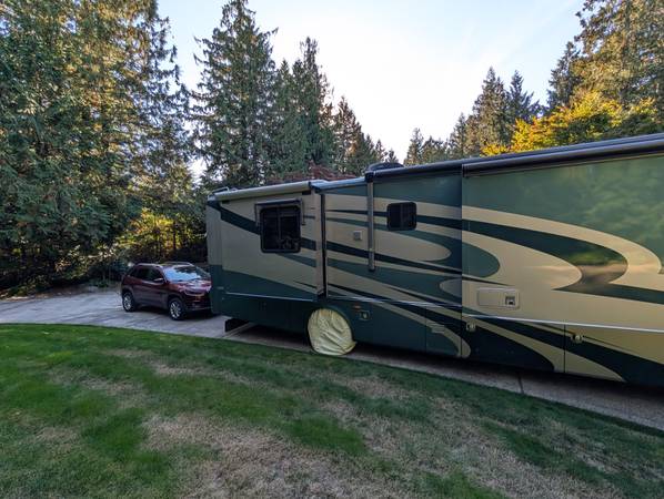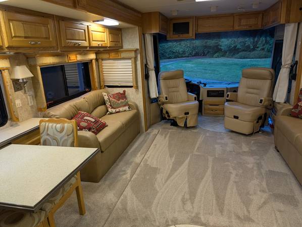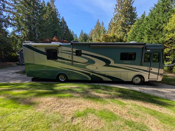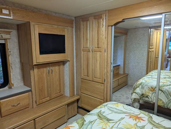 40' Holiday Rambler Endeavor with 4 slide outs. Cummins 400HP Turbo Diesel with Allison 6-speed transmission. This immaculate home-on-wheels has a comfy walk-around queen bed, large fully-equipped bath, and 3-way fridge w/icemaker. Flat-screen TVs in living room and bedroom.