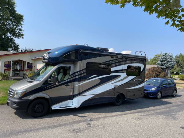 A great American traveling adventure PACKAGE DEAL. A 2016 Mercedes-Benz Sprinter 3500 Thor Citation 24SS Diesel motorhome having a full body paint,two slide outs, a V-6 turbo-charged Diesel engine,5 speed automatic transmission plus 5 speed manual shifting option. It gets +/- 15 mpg towing with air conditioner running depending on the season and terrain used. It carries 26.4 gallons of fuel, 40 gallons of fresh water, 16 gallon’s of Propane and has an Cummings Onan RV-QD 3200 Diesel generator and 3 outside storage compartments, 2 inside tv’s and one outside tv. Has 4 new tires,new awning,satellite dish,new batteries,new cabover paint and two new theater seats. Plus a 2013 Honda Fit Sport with automatic transmission and manual paddles. This 2013 Honda Fit Sport is the last year an Honda automatic transmission vehicle could be towed, all 4 on the ground.The seats fold down creating a very large storage area.The RV has 66k miles and the Honda has 90k miles i with new tires and battery. Complete service records available. Both registered in Washington State.Located in Gig Harbor,Wa.More photos available upon request.