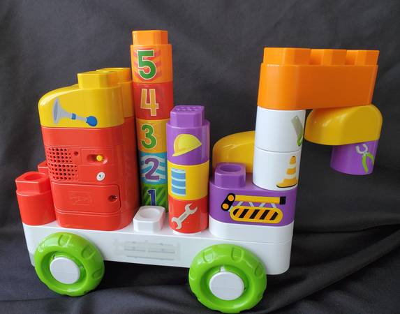 Build, create and learn with this interactive 31-piece truck-themed block set.